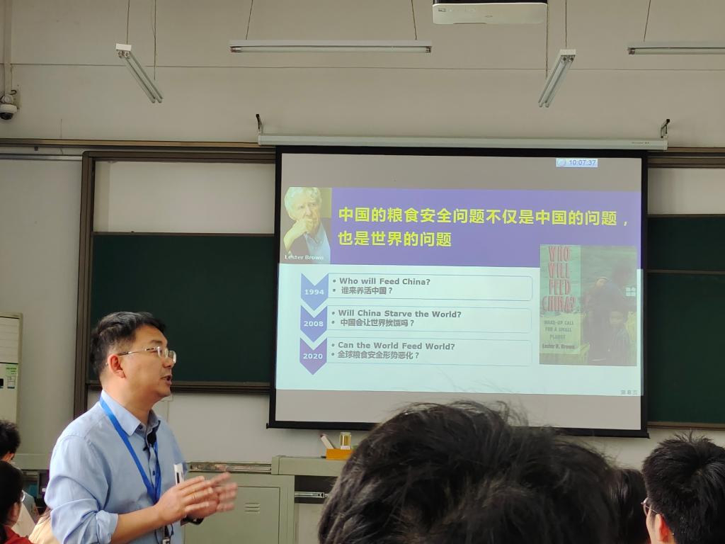 “中国的粮食安全问题不仅是中国的问题,也是世界的问题;它不仅仅是经济问题,还涉及到社会稳定和政治安全,粮食安全是国之大者。”课上,严建兵列举了爱尔兰因马铃薯枯萎病死亡两百万人的例子,告诉同学们粮食是全球博弈的“杀手锏”。授课过程中,严建兵指出当前国际形势下俄罗斯禁止出口粮食给西方引发的“粮食危机”,结合目前学校食堂物价的平稳,让同学们感受社会主义制度的优越性;严建兵结合自身的童年吃红薯饭的经历,从凭粮票供应讲到现在丰富的粮食供应;从收取农业税讲到“三农”支持;从粮食连续增产18年讲到我国农业的丰收为国家应对各种风险起到了“压舱石”的作用,为同学们展示了党领导的政策改革和实践下,我国在“粮食安全”领域取得的重大成就。