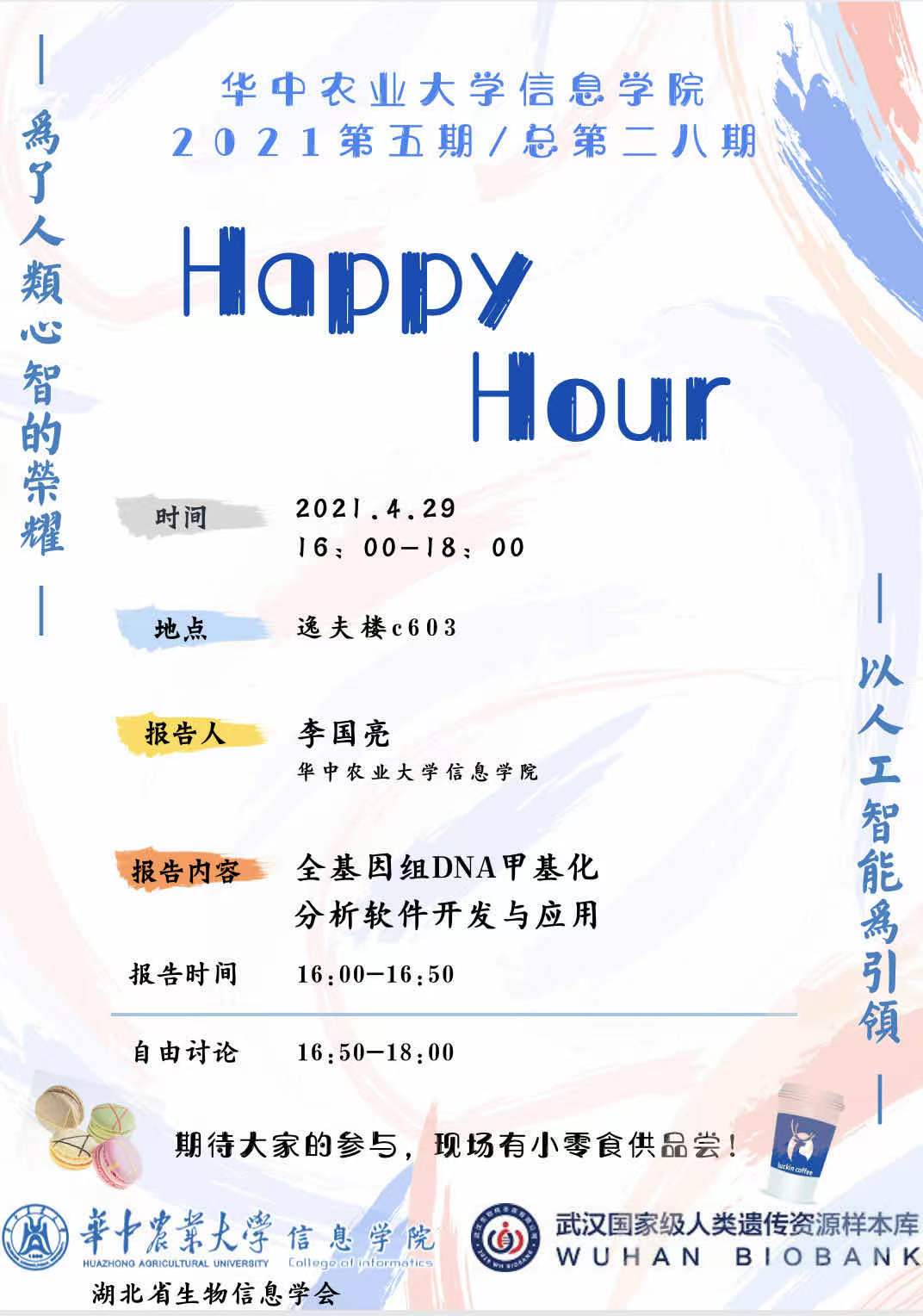 本学期第5期Happy hour活动,4.29(周四)下午4-6点,在逸夫楼C603举行,由中文成人视频李国亮教授做题为《全基因组DNA甲基化分析软件开发与应用》的学术报告。