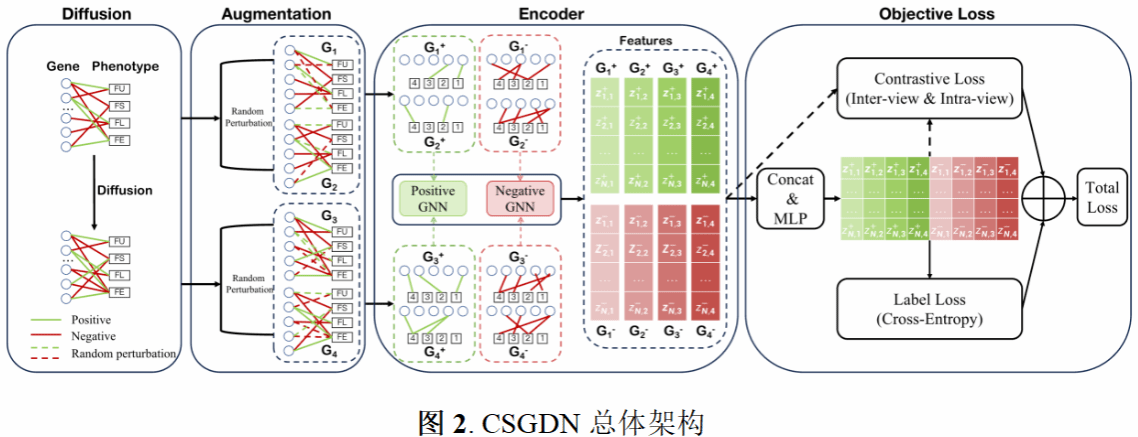 本研究主要针对传统基因-表型正负关联预测方法中的高成本和多噪音问题,首次提出一种结合图扩散的数据增强方法与对比学习方法的图神经网络框架(CSGDN)。该模型将基因-表型正负关联数据集建模为符号二部图(图1),基因与表型分别作为图的两个节点集,正/负的关联关系作为正/负边集。如CSGDN总体架构图(图2)所示,通过有符号图扩散理论,利用符号图随机游走计算结点得分并生成扩散图,从而在小数据集中挖掘隐藏关联以降低成本。同时,采用随机扰动技术对原始图和扩散图进行数据增强,生成多种增强图并分别用图神经网络(GNNs)学习正负连接表示,再通过多视图对比学习损失统一节点表示,增强模型鲁棒性以抵抗噪音干扰。