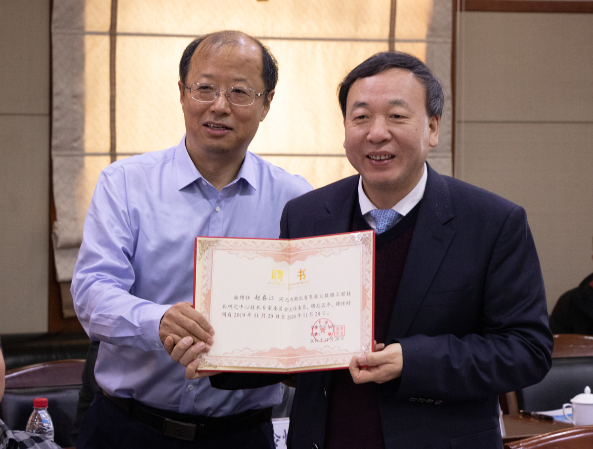 李召虎、赵春江、杨朝新、陈军云参加揭牌仪式,并由校科发院黄依群宣读《关于湖北省农业大数据工程技术研究中心领导班子研究成员及技术委员会委员聘任的通知》。李国亮被聘任为中心主任,倪福川为副主任,同时聘任赵春江院士、李道亮教授等15位专家为中心技术委员会委员,赵春江院士为技术专家委员会主任,人员聘期为5年。