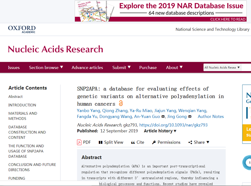 (文|通讯员杨彦波)近日,中文成人视频龚静教授研究团队在《Nucleic Acids Research》(IF:11.1)杂志先后发表题为《ncRNA-eQTL: a database to systematically evaluate the effects of SNPs on non-coding RNA expression across cancer types》和《SNP2APA: a database for evaluating effects of genetic variants on alternative polyadenylation in human cancers》2篇文章。系列文章对多种癌症中遗传变异的功能进行深入分析,发现了大量可调控ncRNA和可选择性多聚腺苷酸化(APA)的遗传变异位点,构建了在线数据库,方便其他研究者使用。