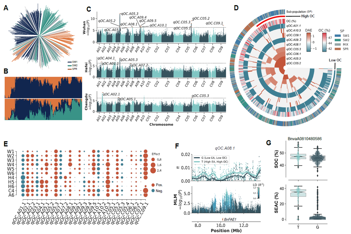 研究利用505份甘蓝型油菜群体的基因组重测序数据以及从中选择的309份代表性材料种子发育中两个时期的转录组数据,通过全基因组关联分析(GWAS)和全转录组关联分析(TWAS)等方法对油菜籽粒含油量的遗传基础进行了系统解析。