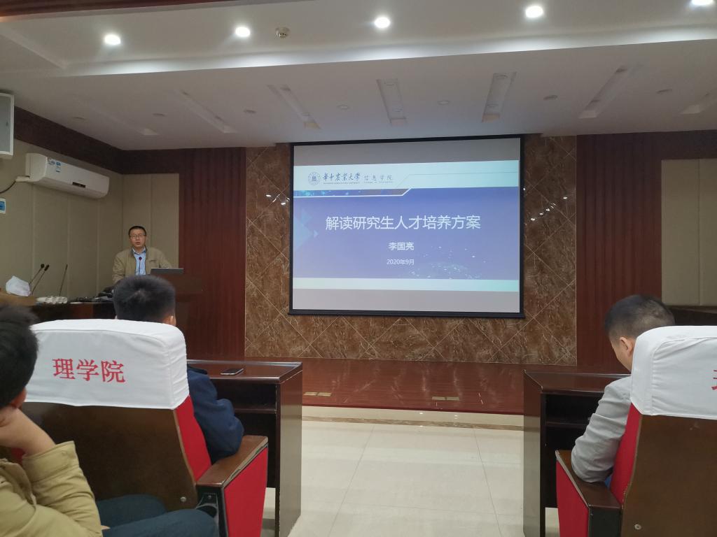 随后,副院长李国亮对2020级的研究生人才培养方案进行了解读,解释了一级二级核心课程和选修课程的设置,以及不同研究方向的学生该如何选课的问题。李国亮强调,选修课不仅仅局限于人才培养方案上罗列的课程,还可以选修其他中文成人视频 的专业基础和前沿课程,成为交叉型人才。接着,他讲解了研究生的毕业基础条件,应当有文章的发表,在这个过程中得到文章撰写水平和科研能力的锻炼和提升。同时,作为华农中文成人视频 的学生,每一位同学还应该以“为了人类心智的荣耀”作为更高的要求而不断努力,奋斗。
