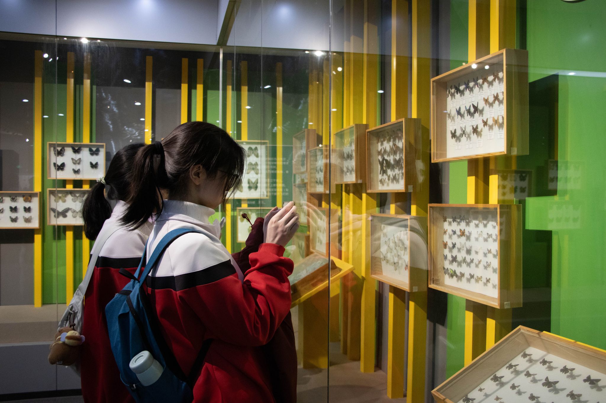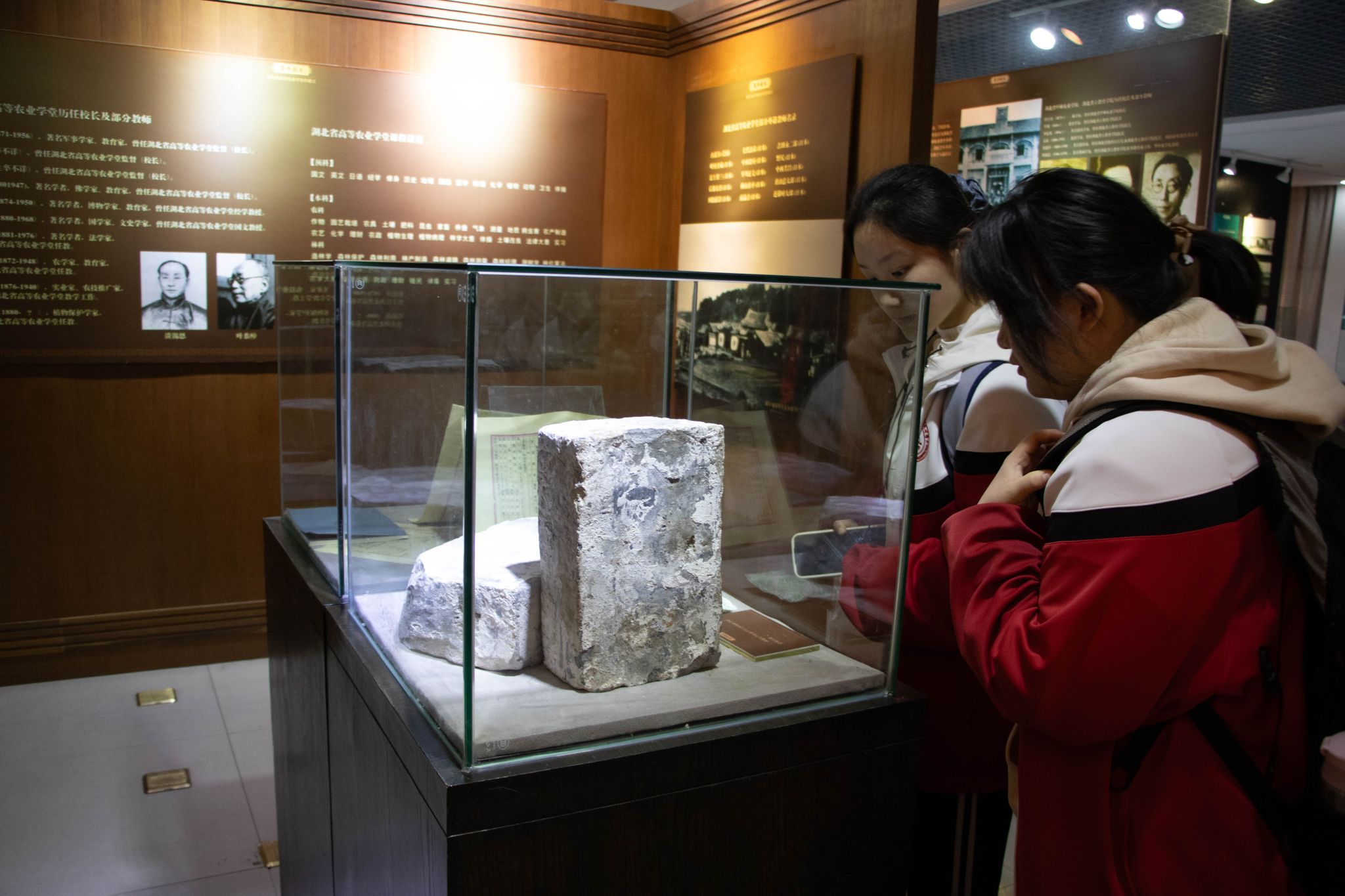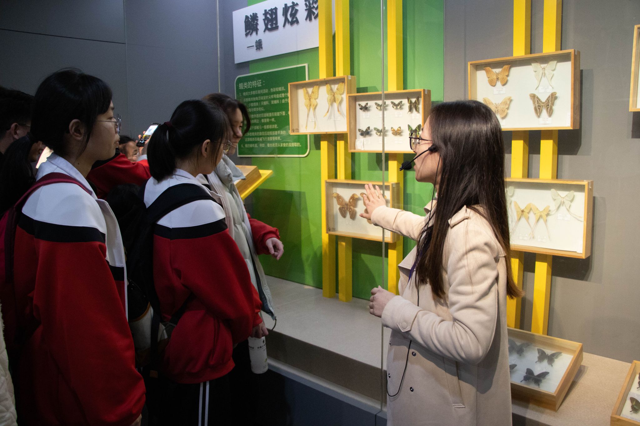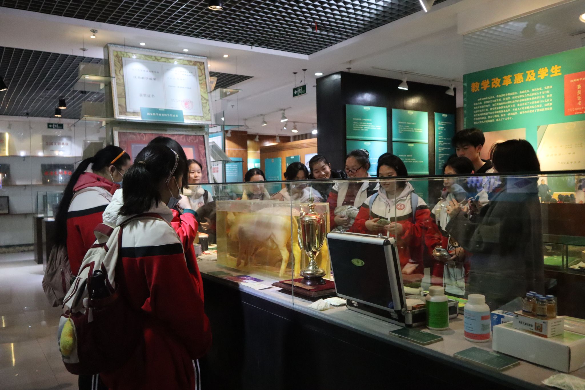 在校史馆,讲解员以张之洞手书《农务学堂章程》开篇,通过介绍学校早期照片和陈列文物帮助同学们了解学校的办学历史和发展历程,结合我校“六个一”标志性成果及在棉花、玉米、番茄和淡水鱼等研究领域的突破性成果,讲解了一代代华农人的成长足迹和所获成就,加深了同学们对学校学科特色的认识与了解。随后,武汉四中师生一行在博物馆开启了一场自然科学探索之旅。等比复原的畜牧标本使得书本知识栩栩如生,引得同学们驻足观察羽毛纹理与骨骼结构。火山岩标本与千年耕作器具并列陈展,投影重现长江流域农耕文明演变史。沉浸式、互动式的学习参观帮助同学们加深了对农业文明与生命科学的认识与理解。