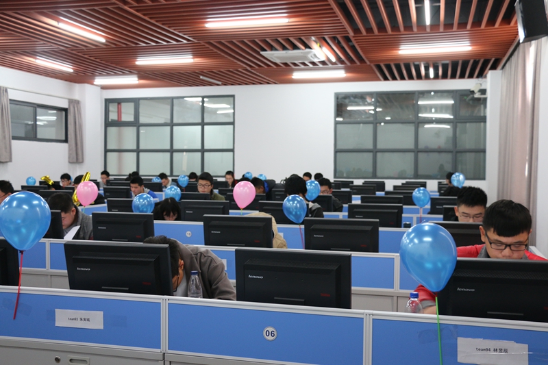 比赛选手可以选择上午9点先在逸夫楼C座101教室进行热身赛。我校计科1604班胡天杨说:“提前来调试一下机器,也是提前熟悉环境,希望这次比赛能取得好的成绩”。比赛于中午12点正式开始。本次大赛出题人兼裁判员是来自我校计科1402班的胡轶凡和李维宇,竞赛共有10道程序设计大题,每道题目难度不同,比赛遵循公平公正原则,选手每答完1题,会有计算机自行检测,无人为因素干扰,系统执行自动化扫描。选手每答完1题,工作人员会为他们插上不同颜色的气球,不同颜色的气球代表选手们解答出了不同的题目,插上气球则是对选手的充分肯定,也激发了答题者的动力,并对其他人给予了压力。
