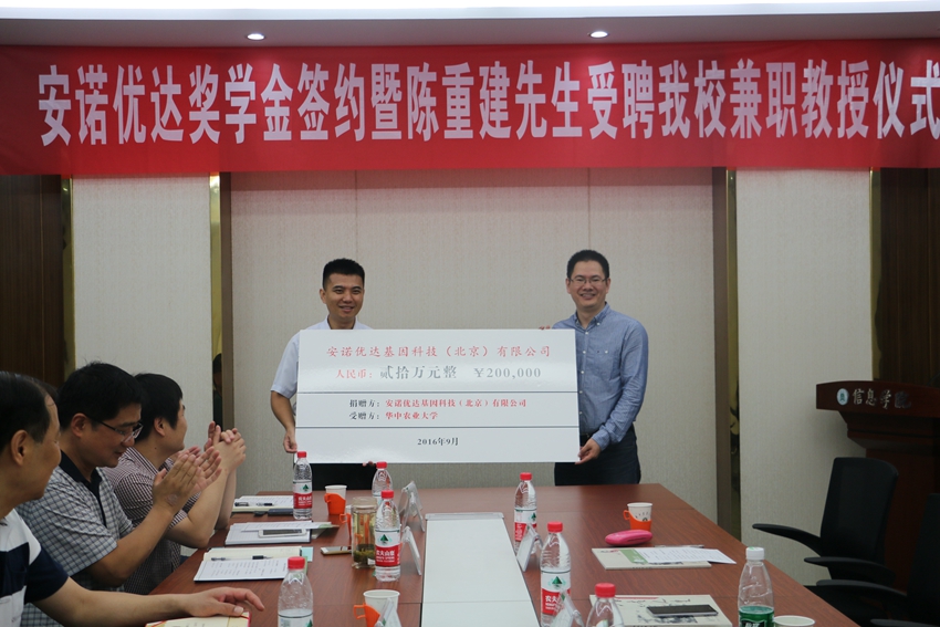 签约受聘仪式由中文成人视频 党委书记李向东主持。中文成人视频 院长张红雨教授与安诺优达基因科技(北京)有限公司首席科技官陈重建先生签订了捐赠协议。根据协议,该公司捐赠20万在中文成人视频 设立企业奖学金,用于我校人才培养。人事处副处长周雄宣读了学校聘任陈重建为兼职教授的文件,校友与基金工作办公室主任陈胜为陈重建颁发了捐赠证书并致辞。
