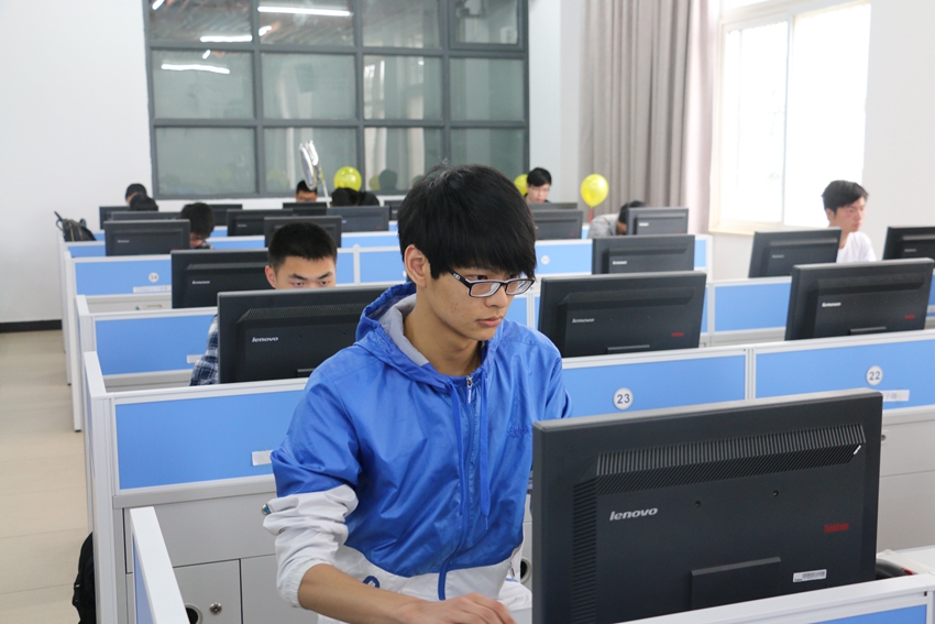 看似安静的教室,竞赛者大脑却在飞速旋转。华中科技大学的女“程序猿”张可目光紧锁屏幕,有条不紊的钻研自己的程序,一直处于领跑状态;我校的江晖同学紧握手中的笔,一次次反复计算,寻找更快速的解决方式;武汉科技大学王捷书细心调试自己的代码,以第一个做出第九题的成绩一路领先。