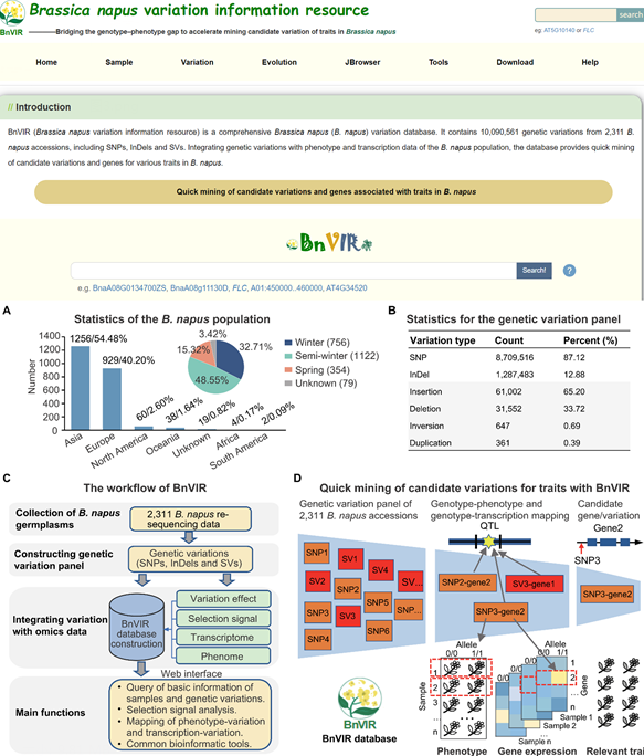 To bridge the gap between genotype and phenotype, we first constructed a large panel of 10,090,561 genetic variations from 2,311 B. napus accessions, and presented the most systematic and complete variation map of B.napus, including SNPs, InDels and various SVs. Then, phenotype data from 18 traits of 1,703 accessions and RNA-seq data of 309 accessions were used as a basis to assemble a B. napus variation information resource (BnVIR; //yanglab.zhwcrsp.com/BnVIR). The database offers various tools for population genetic or evolutionary analysis as well as identification of variations, genes and chromosome features. Case studies of well-known functional variants (FLC.A10, FAE1.A08, FAE1.C03, FAD2.A05) and mining novel candidate variations of traits using our database as well as the independent phenotypic dataset demonstrated the power of BnVIR in mining well-known and novel candidate variations/genes of traits.