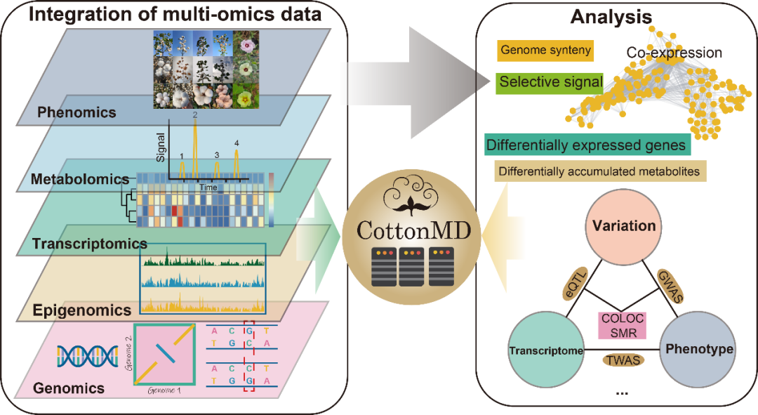 棉花所等多单位在国际权威学术期刊Nucleic Acids Research上联合发表了题为CottonMD: a multi-omics database for cotton biological study的研究论文。该研究通过搜集和整合棉花基因组、转录组、变异组、表观遗传、表型组和代谢组等6个组学的数据,构建出目前最为系统和全面的棉花多组学数据库,为棉花遗传育种研究提供了重要的数据资源和分析平台。