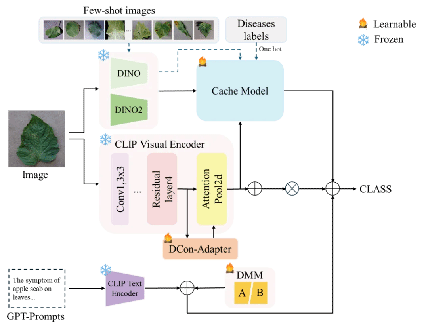 面对农业实践中植物叶片病害数据稀缺的普遍挑战,团队创新性地提出了 PlantCaFo模型。该研究巧妙地以简化的CaFo为基础,创造性利用GPT等生成式人工智能构建了高质量的图像-文本配对数据集,充分融合了 CLIP、DINO 等先进基础模型在视觉与语义理解方面的预训练知识优势,有效弥补了真实病害样本数量的不足,并创新性地设计了 “扩张适配器”(DCon-Adapter) 和 “权重分解模块”(WDM) 。这些设计显著增强了模型捕捉植物病害细微特征的能力,无论是叶片整体的病变模式还是局部的病斑细节,都能被精准提取和分析。