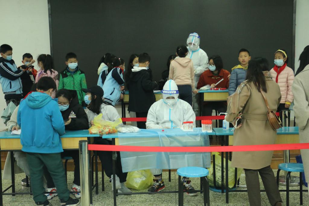 上午9:00,本轮核酸检测工作正式开始,在老师和志愿者们的共同组织下,采样现场井然有序。本次志愿者们的主要工作分别是按照顺序通知各班同学到大厅集合,随后由志愿者进行十人一组分组,并带领到阶梯教室进行采样;采样现场的志愿者们认真核对信息后向小朋友们发放采样拭子和样品采集管。