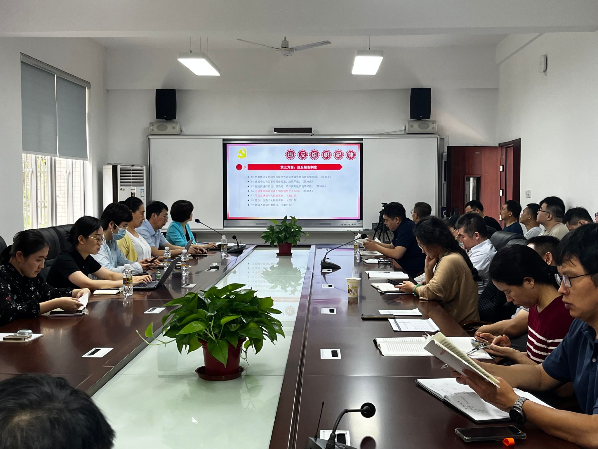 (国际数字影视学院)党纪学习教育专题党课在田家炳楼102举行,全体教工党员参加学习,专题党课由党委书记何映敏主讲。