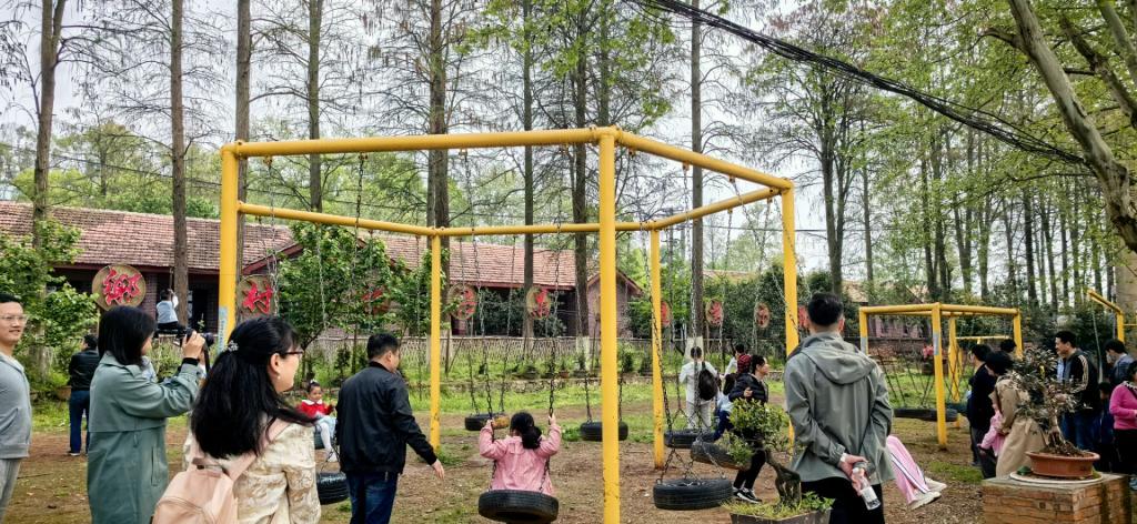 中午一点半,大家在园区职工食堂用过午餐后,开始自由活动。有的陪同小孩一起荡秋千、挖野菜,有的爬山附近小山坡欣赏美景,有的开展“升级”“掼蛋”等智力活动......