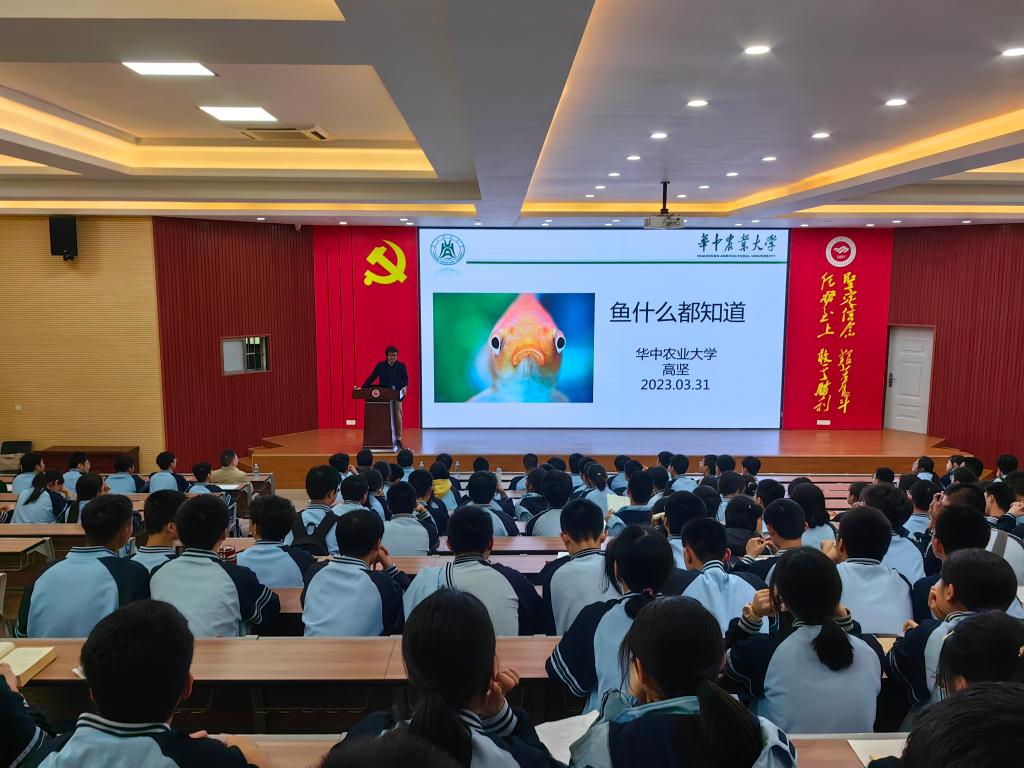 水产中文成人视频 副院长高坚教授分别给两所中学500余名师生带来了主题为“鱼什么都知道”的科普报告。高坚从鱼的类目、视觉、听觉、繁衍等方面带领同学们走进鱼的世界,他从硬骨鱼、软骨鱼的种类切入,介绍了各种鱼的分类及特点。“同学们,你们觉得鱼能听到声音吗?”高坚向同学们问道,并详细介绍了鱼类听觉器官——韦伯式器的功能。随后他分享了鱼的繁衍,当谈到鮟鱇鱼时,高坚说道:“鮟鱇鱼雌雄异体,但是雌性会是雄性的30多倍,雄鱼会寄生在雌鱼身上,这就是鱼类吃软饭的典型!”幽默的语言瞬间点燃了课堂氛围。报告的最后,高坚对在场高中生发出“邀请函”:“欢迎到中文成人视频 ,让我们一同去发现水世界的奥秘。”