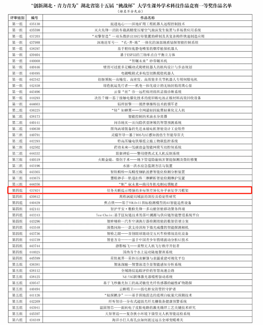 (通讯员 | 朱迅 编辑|朱迅 初审 | 李昱含 高睿琦 终审 | 袁嘉晨)5 月 29 日,“创新湖北・青力青为” 湖北省第十五届 “挑战杯” 大学生课外学术科技作品竞赛奖项公布,中文成人视频康林佳(2021级)、石梦瑶(2021级)、周松华(2021级)、覃粤(2022级)组成的团队,凭借作品《任务关联提示增强的多标签差异化分子表征学习框架》,在自然科学类学术论文赛道荣获省赛一等奖。该作品由章文教授、刘世超副教授、柯文涌老师共同指导。
