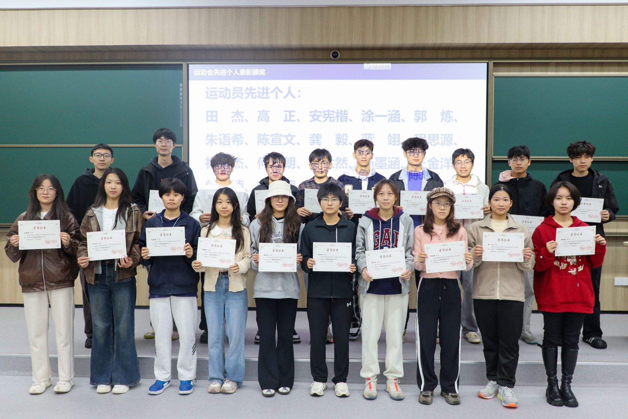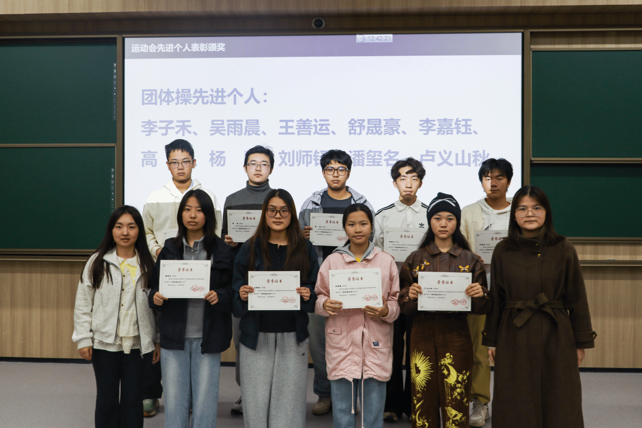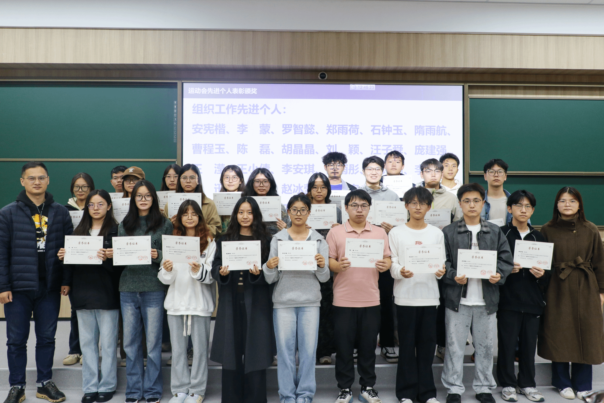 此后,辅导员叶双休、高鹏淇、田昌聪分别为本次运动会中团体操先进个人、运动员先进个人与组织工作先进个人进行表彰颁奖。
